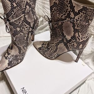 Brand new, never worn Nine West Tirzah, black,white and gray snake skin Boots. They have a 4" heel with a wide ankle and pointed toe. So cute and fun for winter!