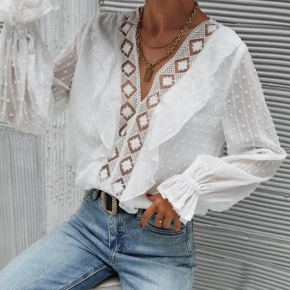 CLASSIC Flounce Sleeve Swiss Dot Blouse - off whit