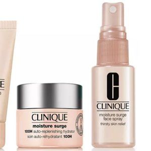 An exclusive set of Clinique's Moisture Surge™ skincare. New Moisture Surge™ 100H Auto-Replenishing Hydrator gel-cream moisturizer that keeps skin hydrated even after washing your face.