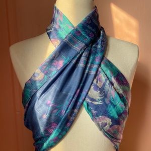 Handmade vintage blue acuarela floral silk scarf.