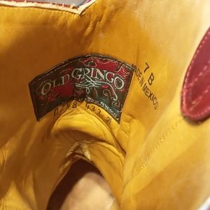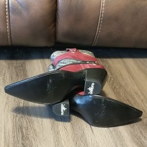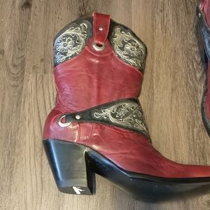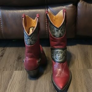 Red mid boot with square toe and silver embossed flower design on top shaft and boot strap