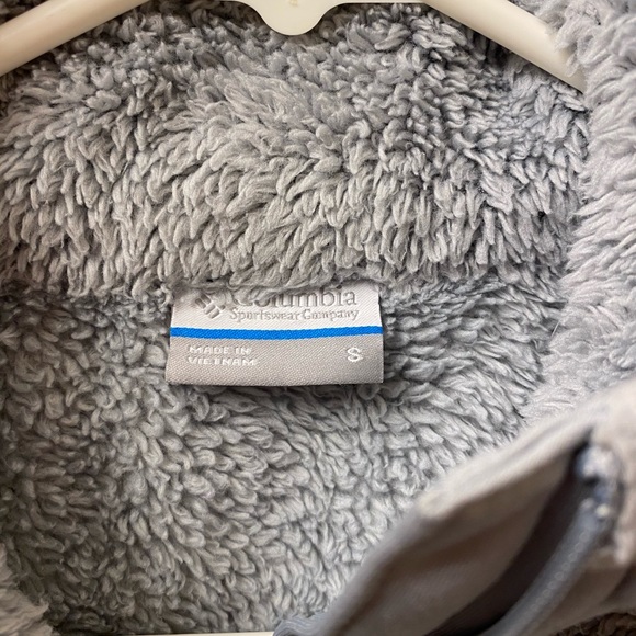 Cute and cozy women’s Columbia brand gray Sherpa jacket. Size: S. Pockets on sides and extra pocket in the chest area. Zipper works perfectly. (Smoke free home).