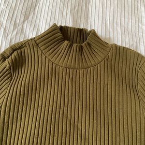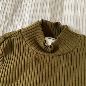 Dark green, ribbed mockneck, blend of cotton, polyester and spandex.