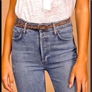 Black,tan,beige leopard print belt with gold hardware. Belt has a soft texture. Measures 41.5in in length with nine hole adjustment.