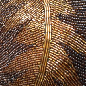 Brown/antique gold color beaded evening bag with 18" handle. Bag measures 8 1/4" w by 5" h by 1 1/2" deep. All beads are in place, none are missing. Bag is in very good condition.