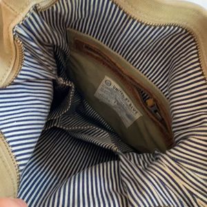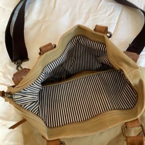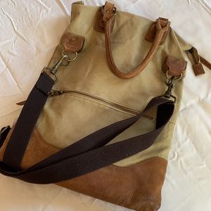 Genuine leather and waxed canvas, from the first era of UBB bags. Can be used as a shoulder tote with short leather straps or a crossbody bag with detachable, adjustable strap. Two exterior zip pockets, one interior zip pocket, and one interior open pocket. Zip closure. 18” x 13.75” when unfolded.