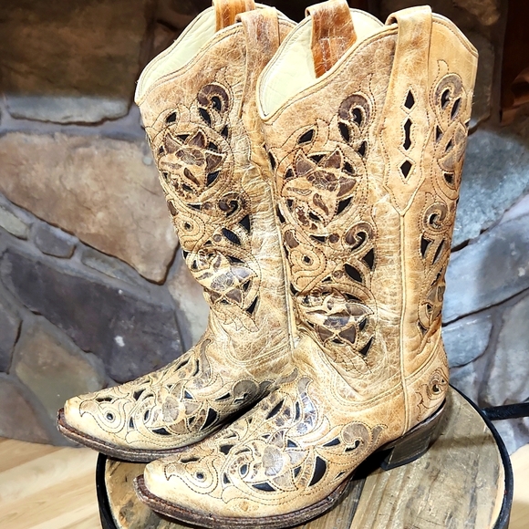 The Antique Saddle Brushed Laser Corral Boots are the perfect pair of comfortable and stylish brown cowgirl boots. We love the distressed, vintage, caramel brown leather. Gorgeous floral cutout designs with darker shades of brown add two-tone effect. This style is whimsical and flirty, but maintains a classic cowgirl feel. These Corral Boots end in a comfortable modern pointed snip toe. The Antique Saddle Brushed Laser Boots will be easy to wear with black or brown and a great match for jeans or dresses.