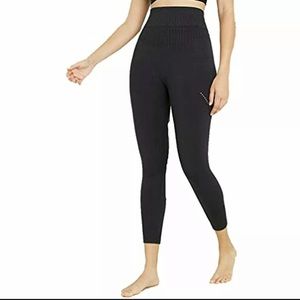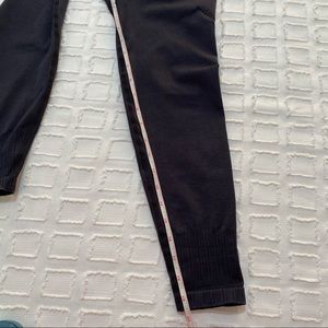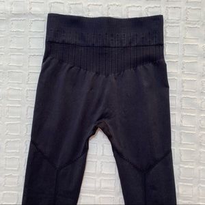 Distressed Black high rise leggings with rib-knit V at the waist and hems of legs with eyelet details.