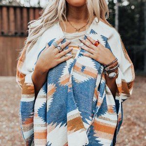 Featuring lightweight but warm knit material patterned with a blue, camel, and white hued aztec print, open side sleeves, and an ultra draped open front silhouette that falls into a straight mid-thigh length hemline with frayed trim detailing!