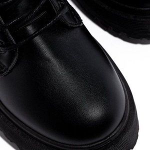 These gorgeous black chunky lug sole combat boots feature a lace-up vamp, rounded toe silhouette, side zip entry, back pull tab, and a low chunky lug sole heel. Made with soft vegan leather materials.