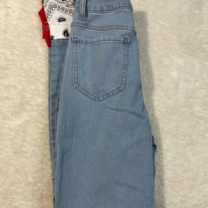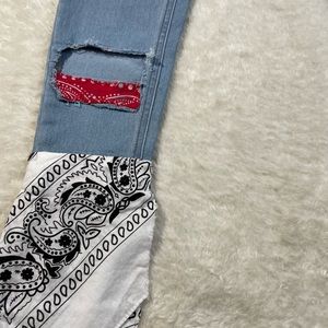 NWOT - brand new without tags Handmade Bandana styled street wear Boho styled jeans soft jeans material 54% cotton 26% polyester up cycle material white,black,red bandana material high rise skinny size: 9 woman’s/ junior jeans