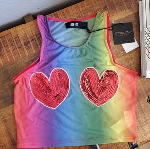 I am selling brand new Iron Fist Somewhere Crop Tanks in sizes X-Small, Small, Medium, Large, X-Large and 2XL. One of the Mediums has a tag that says Large, but it is size Medium. This is rainbow colored, a more sheer-like mesh material, has cute sequence heart patches and is a sleeveless crop top. Such a fun Tank with cute pops of color and would be perfect for your day to day or a date night! NWT (one size M has no packaging, but the rest are in packaging) - never worn - Boutique :)