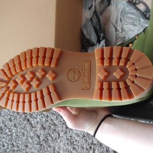 Waterproof limited edition Timberland boots, size 8.5, forest green with black. Orange laces with green lace option. Velvet smooth. Brand new and never worn.