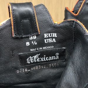 MEXICANA ANKLE BOOTS Detailed WITH metal stars set on top of glitter stars . Red trim on top . I don’t think you will find another pair like this. Let me know if you do. In pristine condition , worn only once. Heels have No signs of wear , only black paint got robbed off a bit off the sole . Tag shows Size 39/8.5. Made in Mexico. The leather and the craftsmanship is superb!