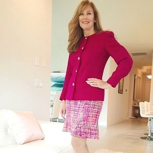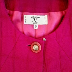 Valentino Pink Magenta Suit Jacket. 💗 This is a gorgeous Vintage in EUC This jacket is made of a nice thick fabric but not heavy. Shoulders have padding. It has a great deal of detail in pattern, big beautiful buttons with gold accents, snap at neck and silk lining. It is a great addition to a design conscious wardrobe!! It is incredibly well made! The color is closest to last photos