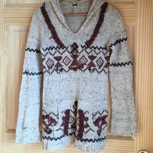 Beautiful Free People with bell sleeves and kangaroo pocket. Design is knitted with a slightly metallic copper yarn as well as different texture blue and red. Comfy and awesome. Used size Medium.