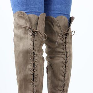 Full Lace-Up Back Taupe Faux Suede Thigh High Over The Knee Lug Block Heeled Boo