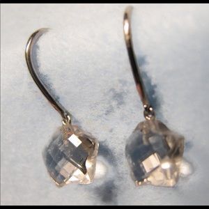 Solid 14k white gold wires above ... not your thin cheap wires though, these are substantial ... hanging freely below, a puffy star charm carved in clear rock crystal quartz (genuine stones, not lab/synthetic), very 3 dimensional ... faceted on both sides, so looks great from any angle ... weigh in at 2.4 grams ... measure 1" long ... stones are is excellent condition with no chips or cracks (any darkness in the pictures is just reflection of items around my light tent) ... stamped 14k ... in excellent vintage condition.