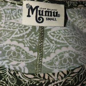 Show Me Your Mumu olive green “Em” mini dress. Swing style. Stretch fabric. Fitted sleeve babydoll.