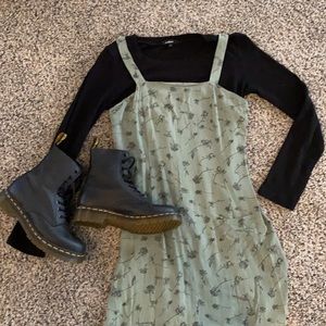 🍂 Vintage Y2K Sage Green Floral Boho Midi Long Fall Dress American Eagle. Super cute with a long sleeve tee underneath and some dr martens! Definitely y2k style!! *Second picture is only to show it styled! This listing includes the dress only! (No undershirt or boots!)* Size women’s 2.