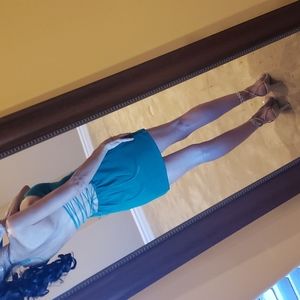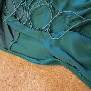 Tiger Mist Franc Corseted-back Green Halter dress, XS. I just love the back detail of this dress. The a-line style is very flattering. Side zipper so corseting stays intact between wearings. True color in pic 15. NWT