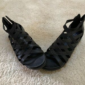 Black leather and elastic at the ankle, gladiator style, comfortable and versatile. Size 7.