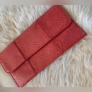 Beautiful coral vegan leather clutch with black and white striped interior. Gold trim on scale pattern. Detachable gold colored chain. One interior magnet has slid down into clutch, but does not impact closing.