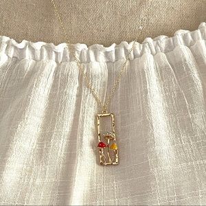 This is such a sweet Piece - the little mushrooms have a cap of crystals and Enamel - they are framed in a Gold Rectangle - this Pendant Necklace to me is the perfect size - not too big and certainly not too small - it can be worn year round Measurements - Approximate