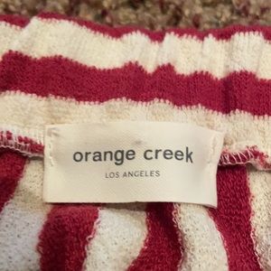 Terry clothe , off white and red striped, rounded hem. Two outside long pockets.