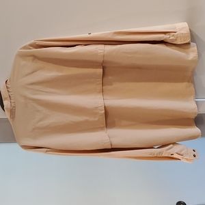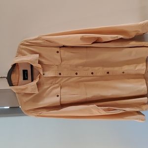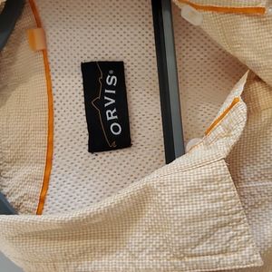 Orange, pin- checkered, feather weight, breezy, waffle textured shirt. Polyester and nylon blend. Used, very good condition.