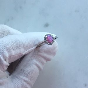 Sterling Pink Lab Opal and Clear CZ Oval Halo Ring