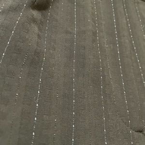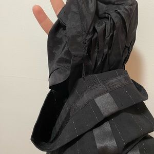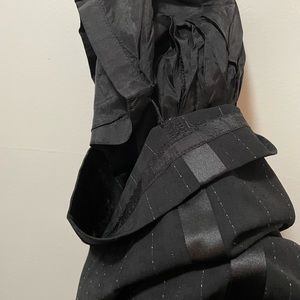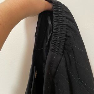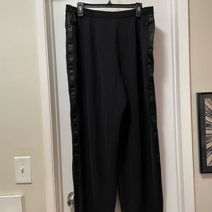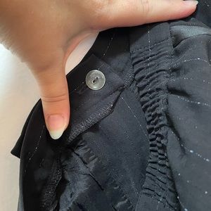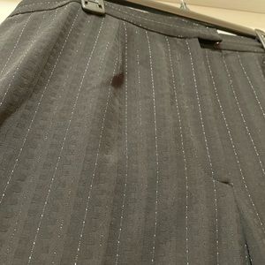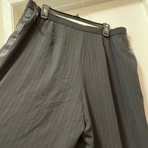 *gorgeous* wide leg suit pants by Amanda Smith- have satin paneling down to seams on the outside of legs from hip to hem, pin stripe all over with light blue threading and the most subtle shine and black square pattern throughout (see closeup pictures). Elastic at the waist and two button closure- one on outside and one inner. FULLY lined. Pockets!