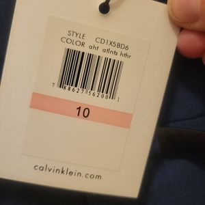 New blueish gray Calvin Klein dress with front pleats and thin black belt. Size 10