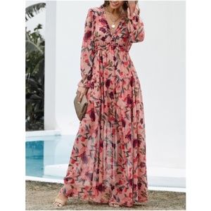 Boho Pink Floral Print V neck Tiered Maxi Dress