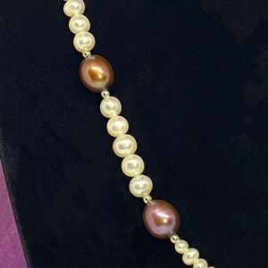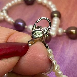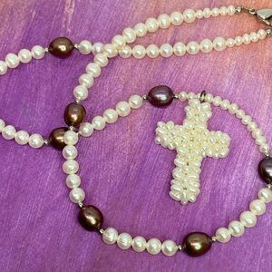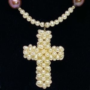 Vintage Lee Sands Fresh Water Pearl Necklace w/a Cross Pendant made of Seed Pearls. Baroque Pearls are of Metallic Color ~ Chocolate & Aubergine. Pendant is 1-1/2”L