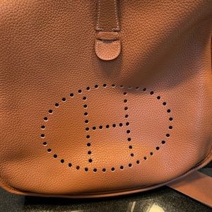 Hermes Evelyn crossbody clemency leather with outside pocket. Bag has been used and has some rubbing on corners please see all pictures. Inside and strap are both in used condition and have used marks. Bag can use professional cleaning. Length is 12”, width is 13” and depth is 4”. I don’t have dust bag or box.