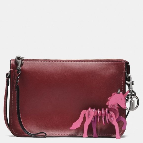 Our playful unicorn bag charm brings a magical touch to a favorite bag or set of keys. She’s crafted in Coach glovetanned leather with glitter edgestain. Glove tanned leather Attached split key ring and dog leash clip