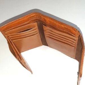 Fossil vintage trifold wallet in a beautiful cinnamon brown color leather. Features a double snap flap closure with a back zip coin pocket. Front exterior rectangular Fossil name plate in silvertone metal. Interior is lined designer Fossil polyester with 13 leather credit card slots & a window ID slot. Four horizontal open slip pockets & 2 bill slots. Preowned & in great condition. See pics for any imperfections. From a smoke free home.