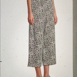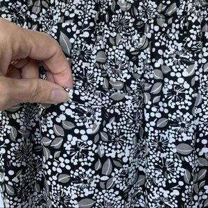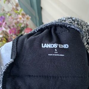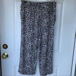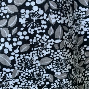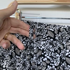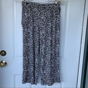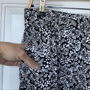 This is a nearly new pair of Sport Knit cropped pants from Lands’ End, size Small (6-8). The comfy knit fabric, 100% cotton, is a floral print in black, gray, and white. Features wide legs, front slash and back welt (still stitched shut) pockets, belt loops, and wide elastic waistband. Perfect for casual work days, or relaxing on the weekend!