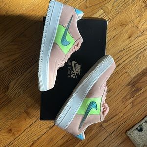 These are some super cool, very rare colored, women’s Nike Air Force 1 ‘07 SE. size 7.5, toe box runs a bit large… I feel would fit a normal 8 as well. Color is a peachy washed coral with really pretty neon baby blue and neon green accents. Swoosh is neon baby blue mesh. Only worn twice. Peachy coral laces. Slight bend in toe box and a few minor scuffs on sole I will clean to best of my ability . As with many Nikes, I feel these run a bit narrow. I had foot surgery and my foot just swells too much. Not for you if you have a wide foot. Love these but gotta let ‘‘em go. 🧡😞