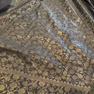 Beautiful Banarasi silk saree with golden zari weaving pallu and border. Comes with zari brocade blouse fabric