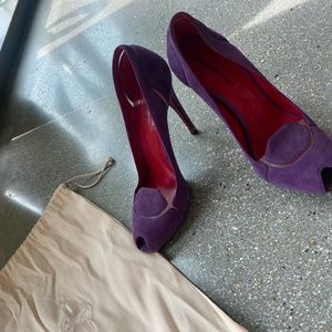 This one of a kind pump is an attention grabber. Suede is good as new. Color is so unique and rich. Normal wear on the bottom front. heels are good as new.