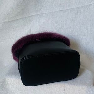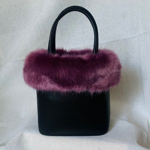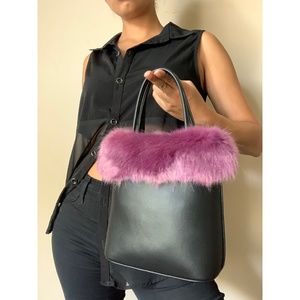 Vegan Leather Faux Fur Top Handle Handbag - Black Purple
