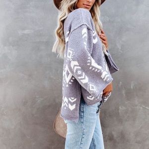 Brand New Soft Knit Sweater. This plush piece displays a grey/white abstract Aztec pattern on a super soft knit! Featuring a scoop neckline, side slits and long sleeves.