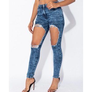 Blue Acid Wash High Waist Ripped Distressed Skinny Denim Jeans Pant