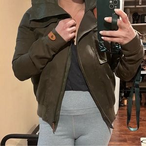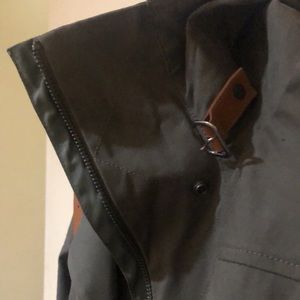 Hooded utility jacket by Lacoste. Good features a zipper to expand collar. Leather trim details at collar and cuffs. Excellent condition!