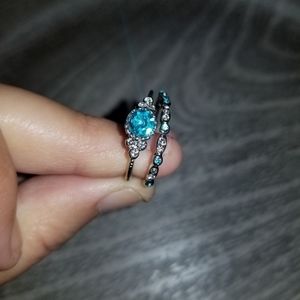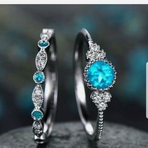 Brand new and high quality. Rich lab created Blue saphire with crystal zircons. Silver plated band. 2pc set. Small and dainty. Cross posted. Colors may appear different due to lighting.