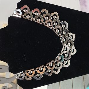 Intricate triple-layered scalloped bib design with a polished silver-tone finish.