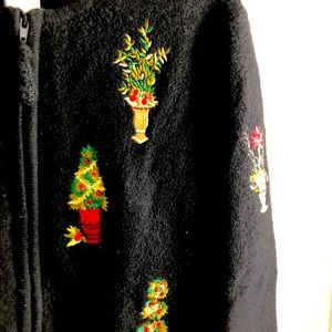 Susan Bristol beautiful Christmas boiled wool holiday sweater vintage 90s tree topiary holly embroidery embroidered size large. 21 across the chest 23 long 16 back 31 arm length from middle back of collar to sleeve hem.