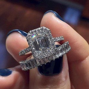 Engagement Radiant CZ Micro Pave Silver Plated Wedding Ring Set, L538